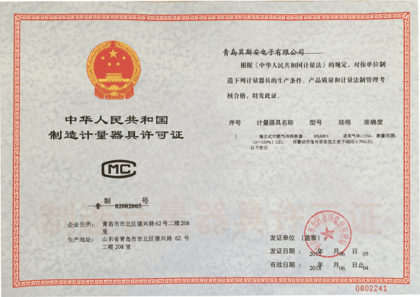 我公司是青島市具有國家質(zhì)量技術(shù)監(jiān)督部門頒發(fā)的計量器具生產(chǎn)許可證的生產(chǎn)企業(yè);獲得國家防爆電氣產(chǎn)品質(zhì)量監(jiān)督檢驗中心頒發(fā)的防爆合格證;獲得國家公安部消防產(chǎn)品合格評定中心頒發(fā)的消防產(chǎn)品形式認可證書。